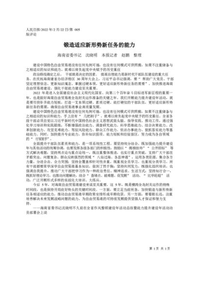 / 署名文章:2022.02.22海南省委书记沈晓明本报记者赵鹏:锻造适应新形势新任务的能力