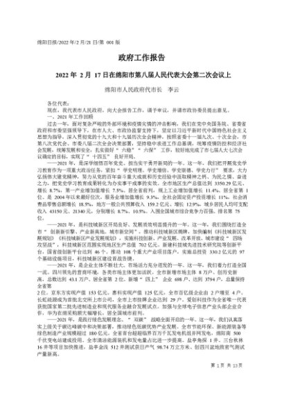 / 署名文章:2022.02.21绵阳市人民政府代市长李云:政府工作报告