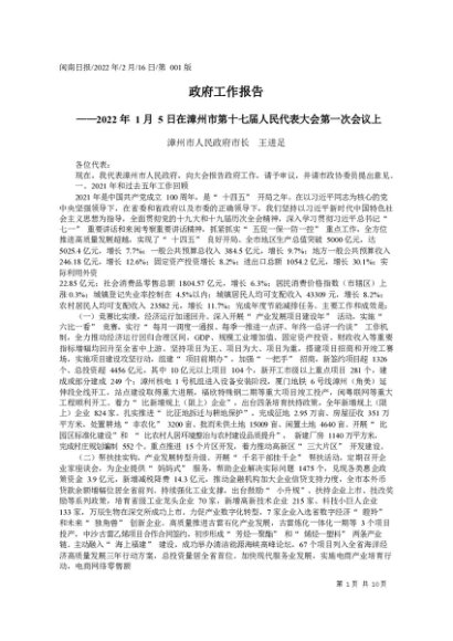 署名文章:2022.02.16漳州市人民政府市长王进足:政府工作报告