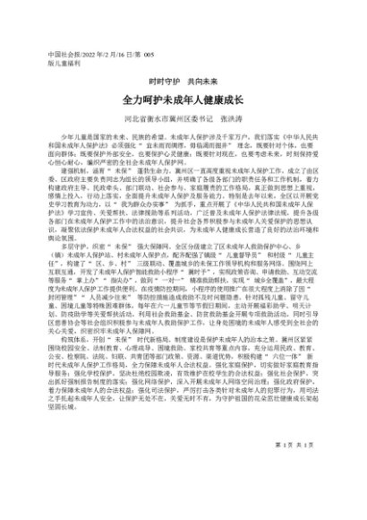 署名文章:2022.02.16河北省衡水市冀州区委书记张洪涛:全力呵护未成年人健康成长