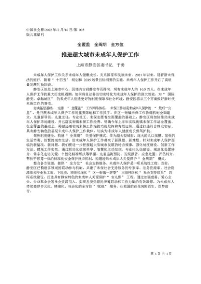 / 署名文章:2022.02.16上海市静安区委书记于勇:推进超大城市未成年人保护工作