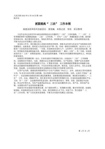 / 署名文章:2022.02.14政和县科技副县长裴俊巍本报记者常钦采访整理:抓紧提高三农工作本领