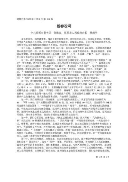 署名文章:2022.02.01中共邯郸市委书记张维亮邯郸市人民政府市长樊成华:新春祝词