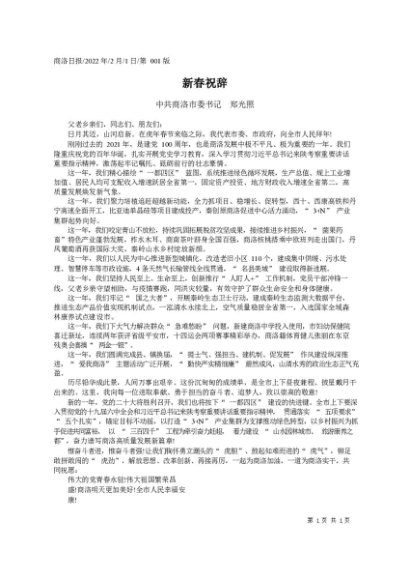署名文章:2022.02.01中共商洛市委书记郑光照:新春祝辞