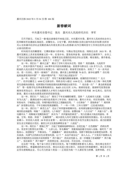 / 署名文章:2022.01.31中共嘉兴市委书记张兵嘉兴市人民政府代市长李军:新春献词