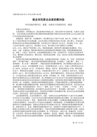 / 署名文章:2022.01.30中共乌海市委书记唐毅乌海市人民政府市长杨进:致全市民营企业家的慰问信