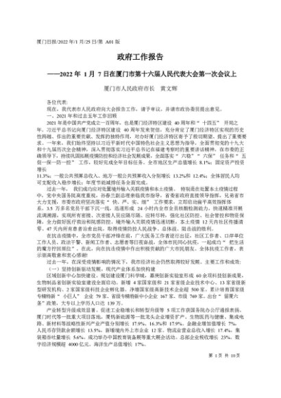 署名文章:2022.01.25厦门市人民政府市长黄文辉:政府工作报告