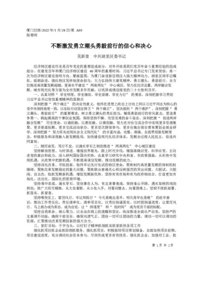 署名文章:2022.01.24吴新奎中共湖里区委书记:不断激发勇立潮头勇毅前行的信心和决心