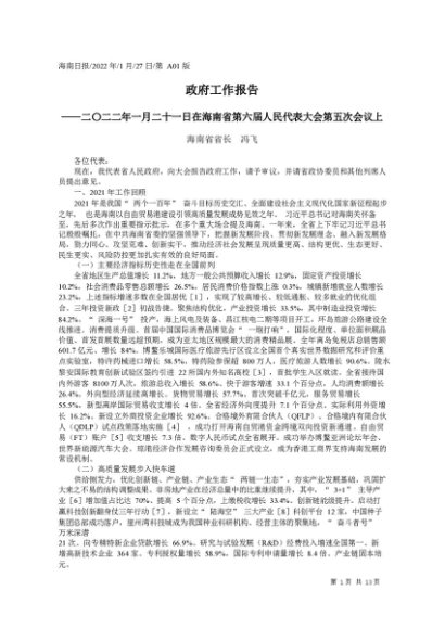 / 署名文章:2022.01.27海南省省长冯飞:政府工作报告
