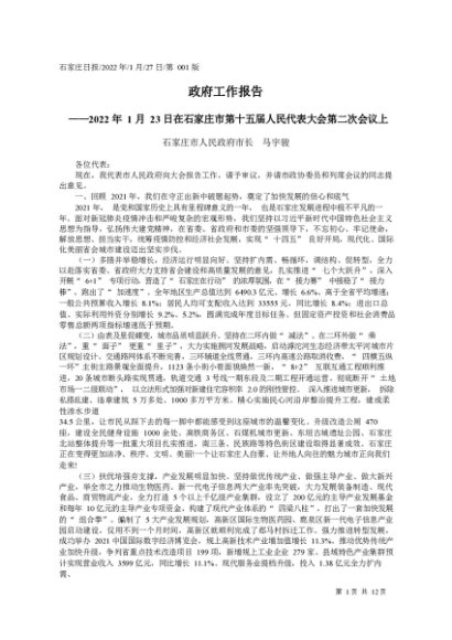 署名文章:2022.01.27石家庄市人民政府市长马宇骏:政府工作报告