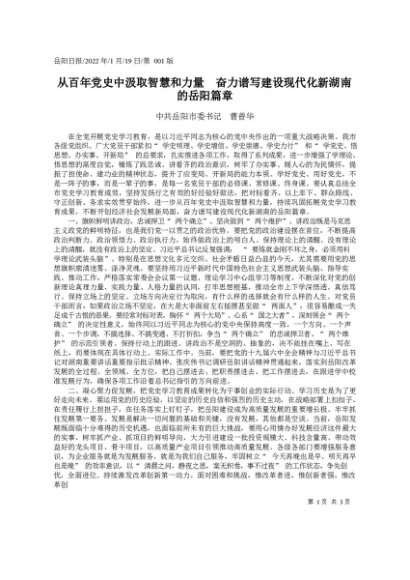 / 署名文章:2022.01.19中共岳阳市委书记曹普华:从百年党史中汲取智慧和力量奋力谱写建设现代化新湖南的岳阳篇章