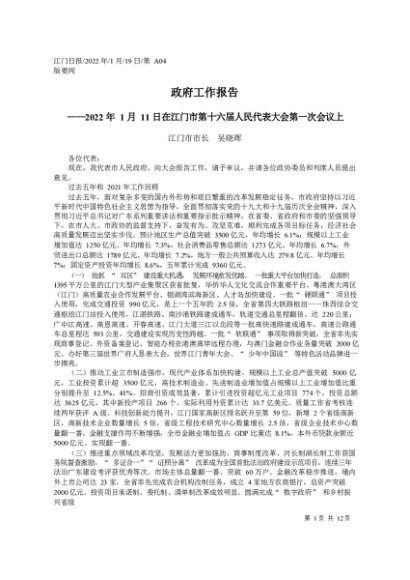 署名文章:2022.01.19江门市市长吴晓晖:政府工作报告