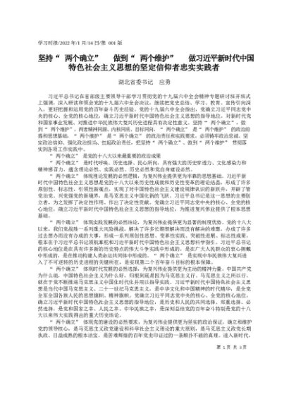 署名文章:2022.01.14湖北省委书记应勇:坚持两个确立做到两个维护做习近平新时代中国特色社会主义思想的坚定信仰者忠实实践者