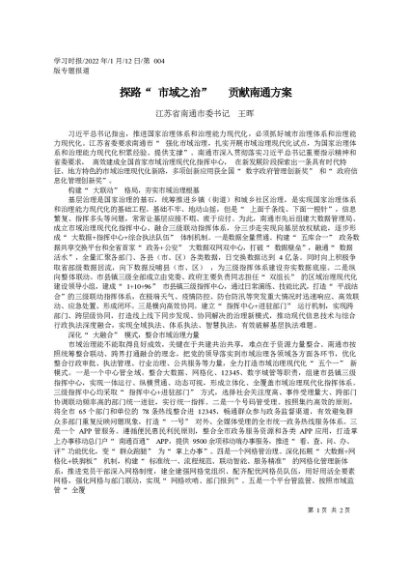 署名文章:2022.01.12江苏省南通市委书记王晖:探路市域之治贡献南通方案