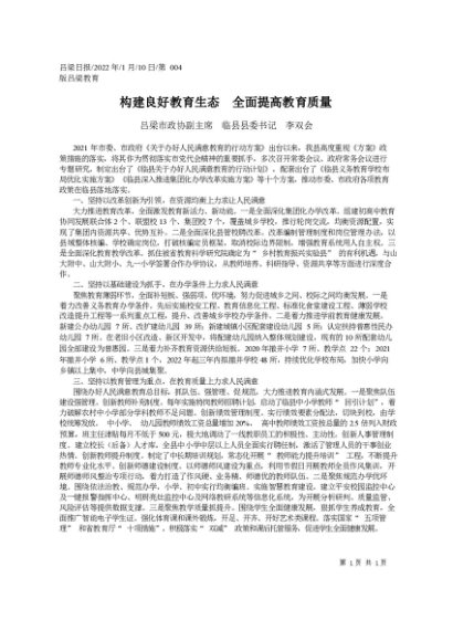 署名文章:2022.01.10吕梁市政协副主席临县县委书记李双会:构建良好教育生态全面提高教育质量