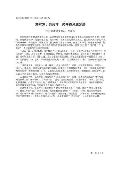 署名文章:2022.01.05中共延津县委书记李泽宙:精准发力治顽疾转变作风抓发展