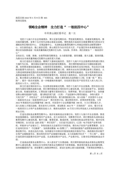 / 署名文章:2022.01.09中共青山湖区委书记袁一旦:领略全会精神全力打造一枢纽四中心