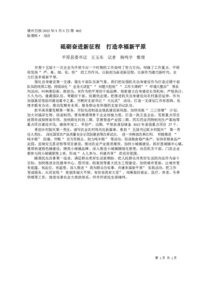 署名文章:2022.01.01平原县委书记王玉东记者杨鸣宇:砥砺奋进新征程打造幸福新平原