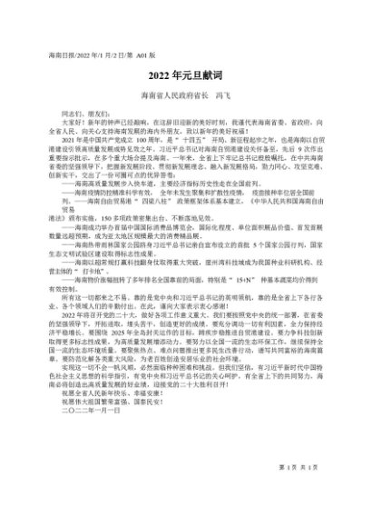 / 署名文章:2022.01.02海南省人民政府省长冯飞:2022年元旦献词