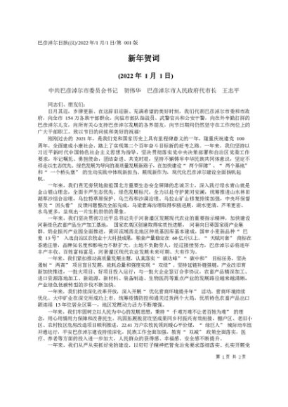 / 署名文章:2022.01.01中共巴彦淖尔市委员会书记贺伟华巴彦淖尔市人民政府代市长王志平:新年贺词