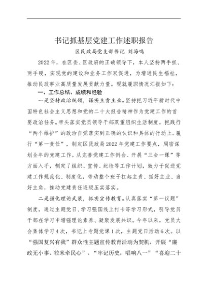 / 述职报告:2022年度书记抓基层党建工作述职报告(民政局)