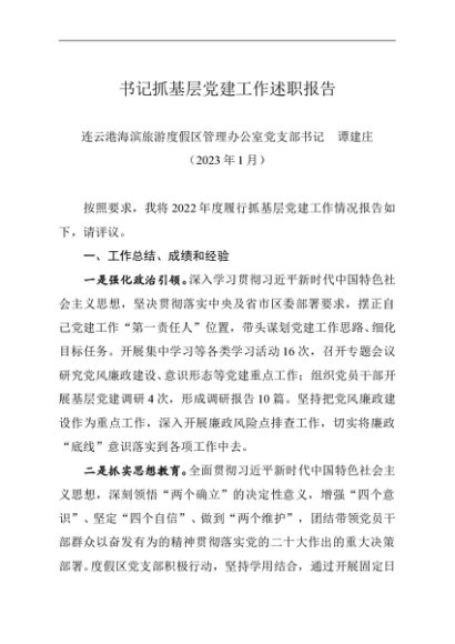 / 述职报告:2022年度书记抓基层党建工作述职报告(海滨旅游度假区)