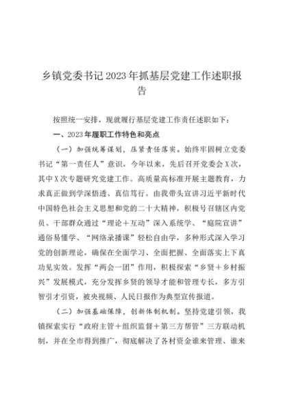 / 述职报告:2023年乡镇党委书记抓基层党建工作述职报告