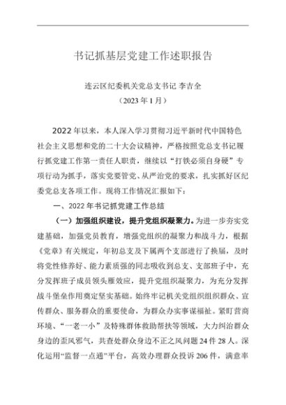 / 述职报告:2022年度书记抓基层党建工作述职报告(纪委)