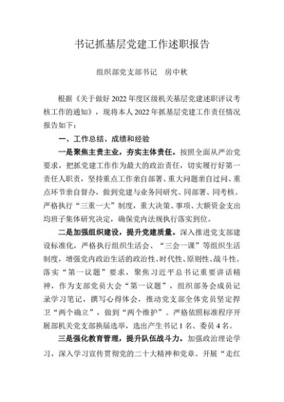 / 述职报告:2022年度书记抓基层党建工作述职报告(组织部)