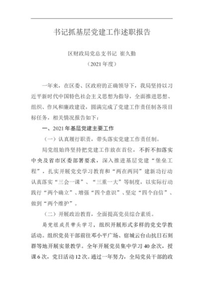 / 述职报告:2021年度书记抓基层党建工作述职报告(财政局)