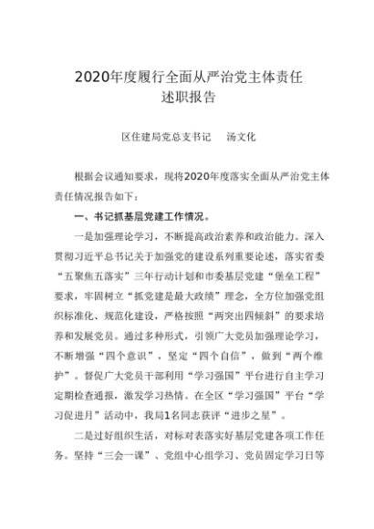 / 述职报告:2020年度履行全面从严治党主体责任述职报告(住建