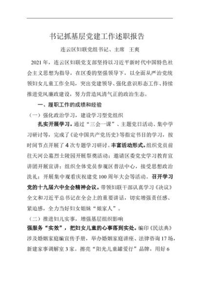 / 述职报告:2021年度书记抓基层党建工作述职报告(妇联)
