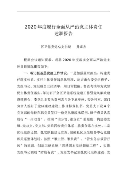 / 述职报告:2020年度履行全面从严治党主体责任述职报告(卫健