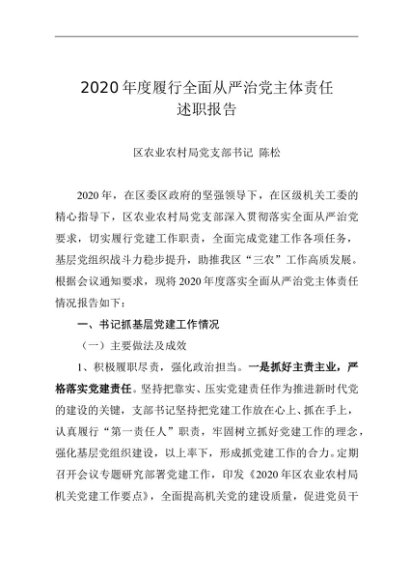/ 述职报告:2020年度履行全面从严治党主体责任述职报告(农业