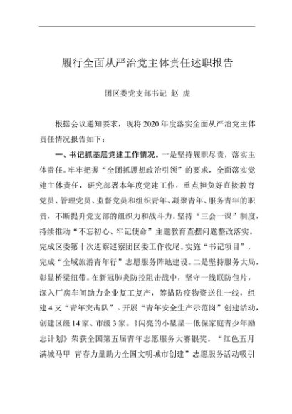 / 述职报告:2020年度履行全面从严治党主体责任述职报告(团区