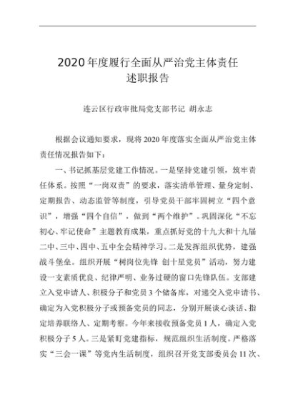 / 述职报告:2020年度履行全面从严治党主体责任述职报告(行政