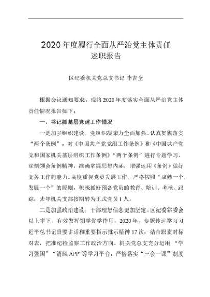 / 述职报告:2020年度履行全面从严治党主体责任述职报告(纪委