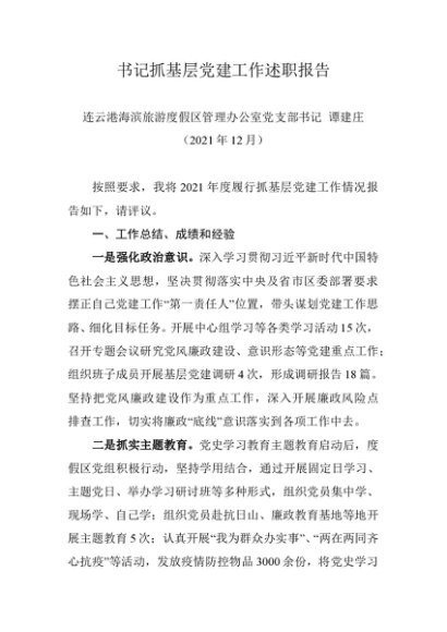 / 述职报告:2021年度书记抓基层党建工作述职报告(旅游度假区