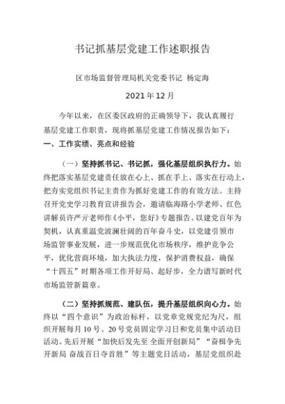 / 述职报告:2021年度书记抓基层党建工作述职报告(市场局)