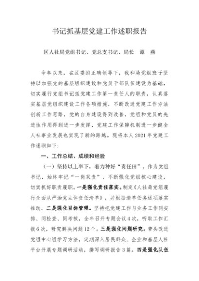 / 述职报告:2021年度书记抓基层党建工作述职报告(人社局)