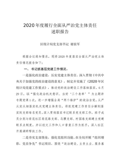 / 述职报告:2020年度履行全面从严治党主体责任述职报告(统计
