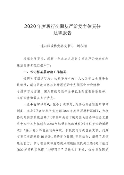 / 述职报告:2020年度履行全面从严治党主体责任述职报告(政协