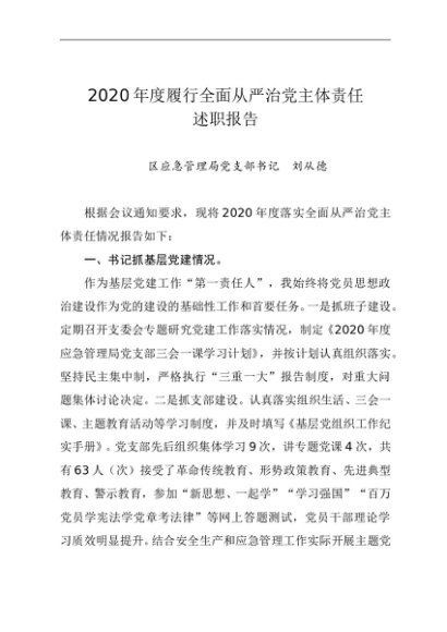 / 述职报告:2020年度履行全面从严治党主体责任述职报告(应急
