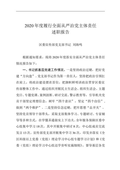 / 述职报告:2020年度履行全面从严治党主体责任述职报告(宣传
