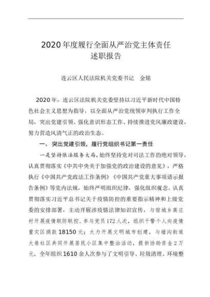 / 述职报告:2020年度履行全面从严治党主体责任述职报告(法院