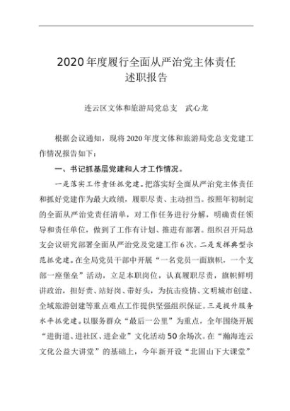 / 述职报告:2020年度履行全面从严治党主体责任述职报告(文体