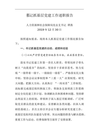 / 述职报告:2019年度书记抓基层党建工作述职报告(人社局)
