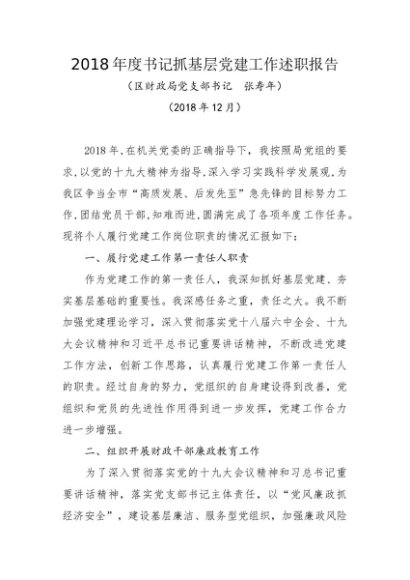 / 述职报告:2018年度书记抓基层党建工作述职报告(财政局)