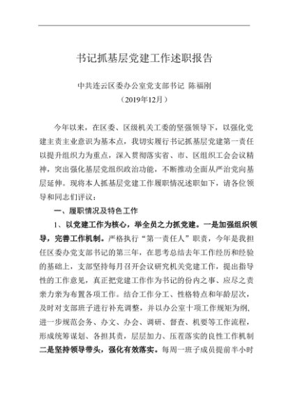 / 述职报告:2019年度书记抓基层党建工作述职报告(区委办)