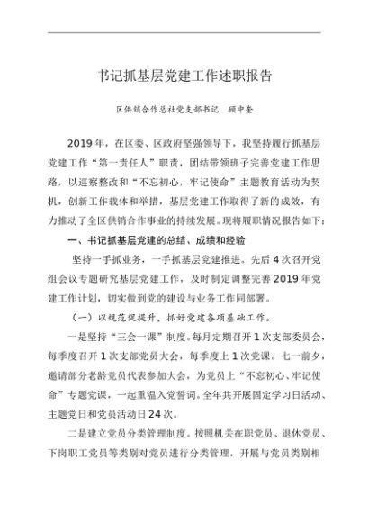 / 述职报告:2019年度书记抓基层党建工作述职报告(供销总社)